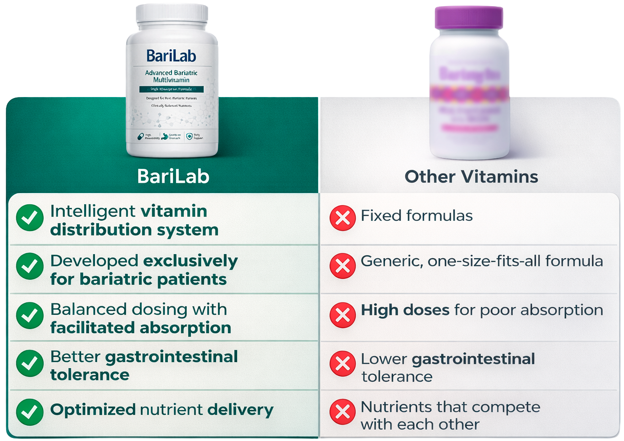 While traditional vitamins use one-size-fits-all formulas, high doses, and nutrients that compete with each other—often causing lower gastrointestinal tolerance—BariLab is engineered to work with the bariatric digestive system, not against it.
